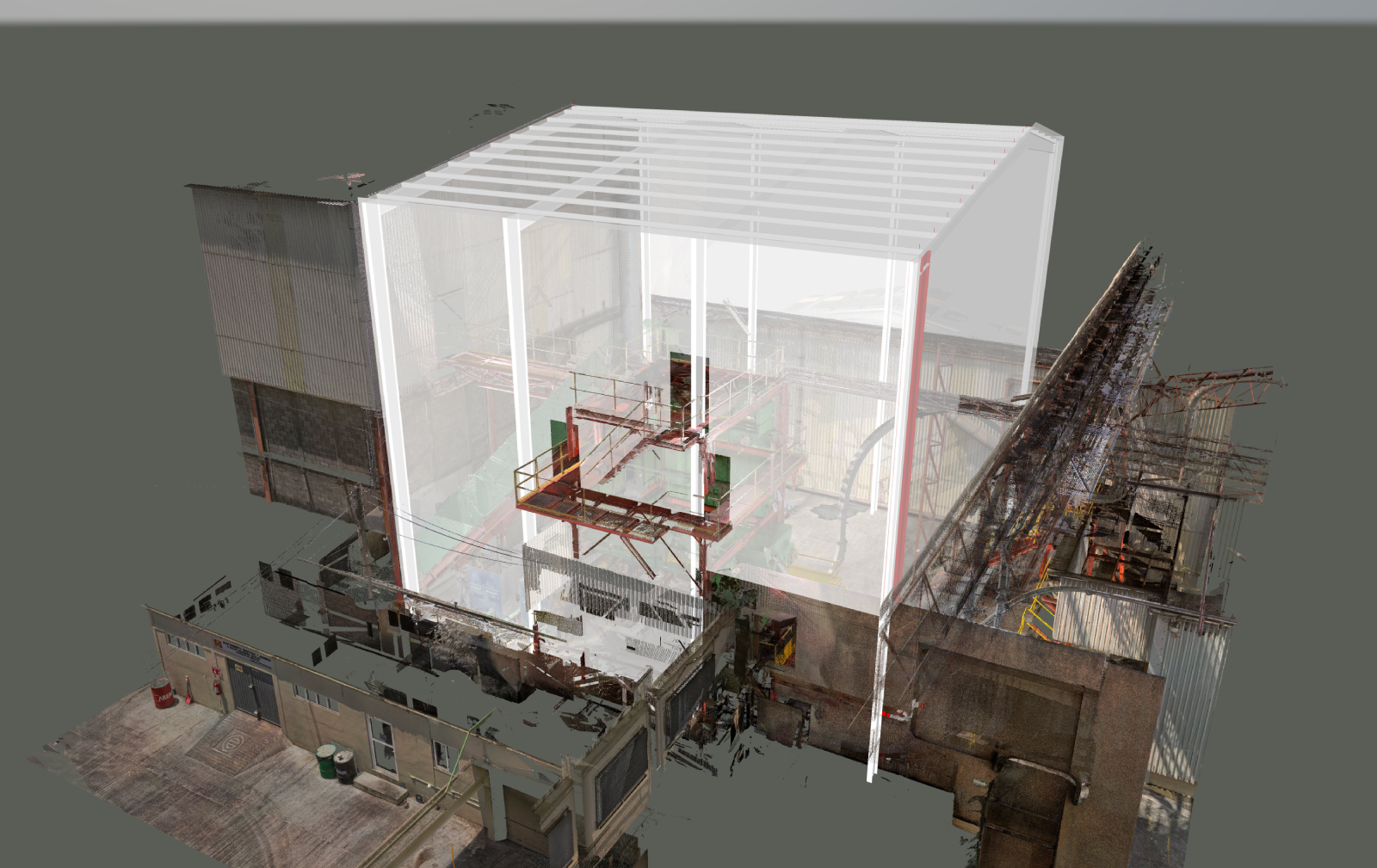 Se desarrolló la ingeniería civil y eléctrica del edificio de contención para la torre de trituración. Previo al diseño, se realizó un escaneo láser para generar la nube de puntos y asegurar precisión en la ubicación de la estructura.