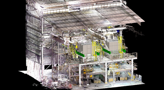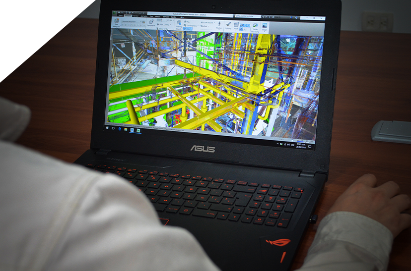 Previo al desarrollo del proyecto, se realizó un escaneo láser del área para generar una nube de puntos que sirviera como base precisa para la verificación geométrica. Esta información permitió identificar interferencias, validar compatibilidades dimensionales y asegurar que los diseños cumplieran con criterios de seguridad, eficiencia y precisión, garantizando una transición confiable hacia la etapa de detalle y montaje.