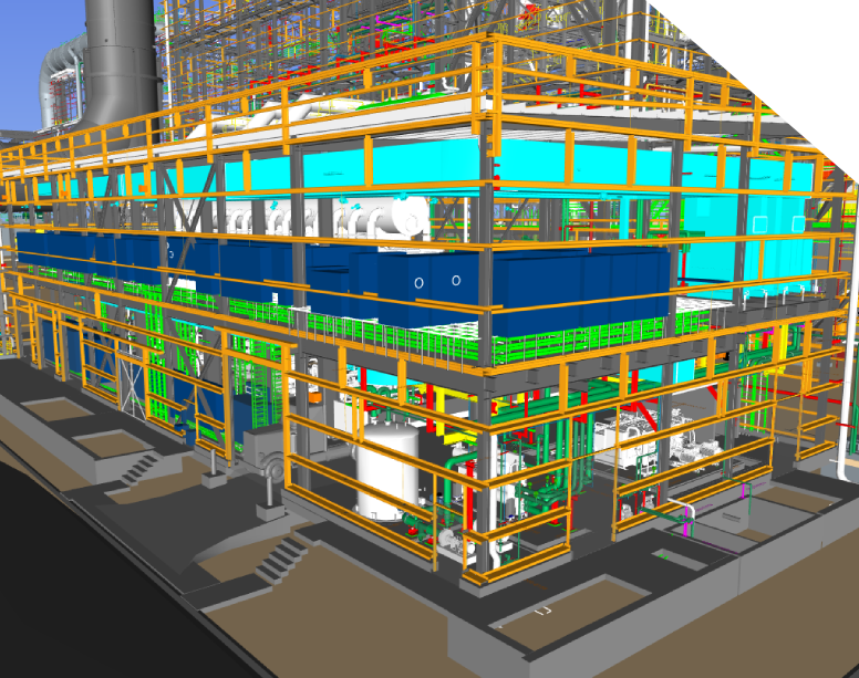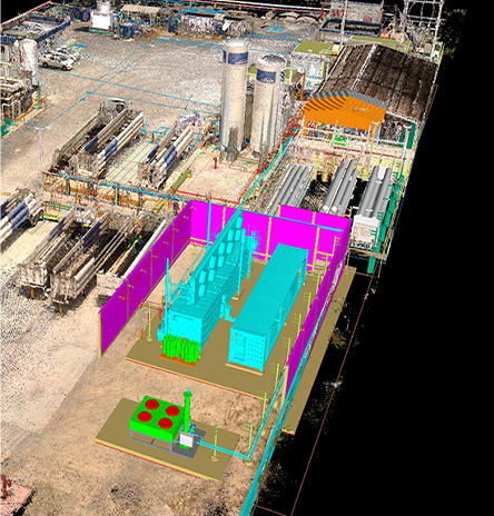 El proyecto contempló la modernización de equipos críticos, incluyendo el compresor de hidrógeno, con el fin de optimizar la eficiencia del proceso electrolítico. Para garantizar precisión en el diseño, se realizó un escaneo láser 3D, generando la nube de puntos del área existente. Se redefinieron los recorridos de tuberías, tomando en cuenta trazados, pendientes, diámetros y soportes, utilizando materiales compatibles con hidrógeno para asegurar operación segura y confiable.